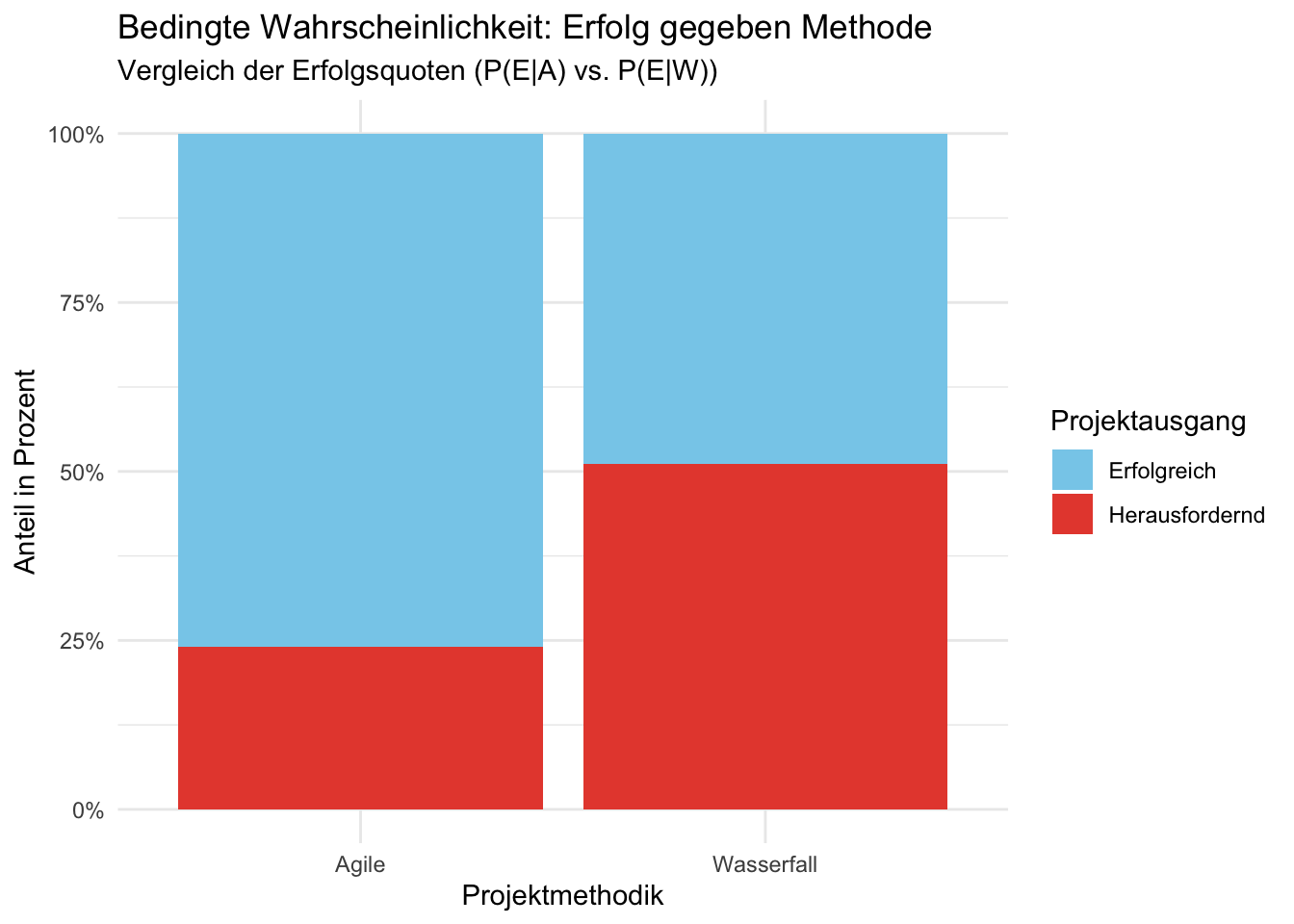 Interpretation: Hier sehen wir deutlich, dass der hellblaue Bereich bei “Agile” ca. 76 % des Balkens ausmacht, während er bei “Wasserfall” nur knapp unter 50 % liegt. Wenn wir also eine Projektmethode wählen, dann haben wir bei der agilen Methode eine viel höhere Erfolgswahrscheinlichkeit als beim traditionellen Wasserfall. Wir visualisieren also die Erfolgswahrscheinlichkeit unter der Bedingung der gewählten Methode.